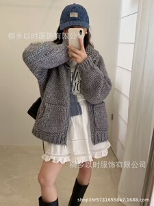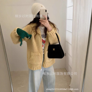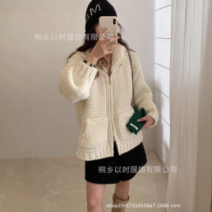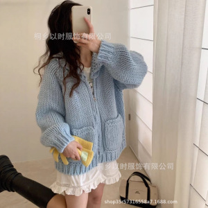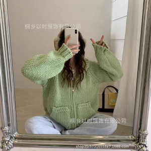 以时 韩系简约棒针翻领羊毛毛衣外套 秋冬超厚粗针拉链针织开衫女
