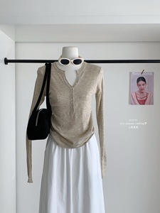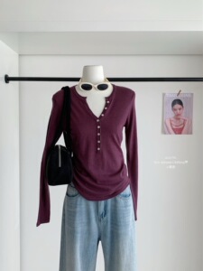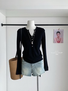 纽扣半开领修身针织长袖女2025秋季新款弹力T恤打底衫上衣潮