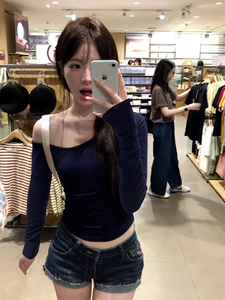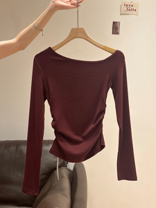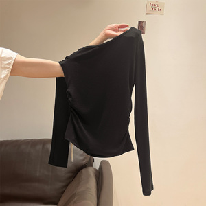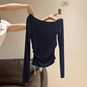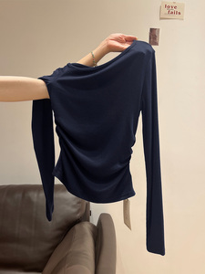 藏蓝色1斜肩露肩长袖t恤女2025秋季褶皱小众设计感内搭打底衫上衣