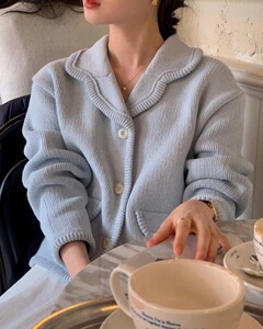现 货 韩国chic 时尚温柔系复古小香风蓝色针织毛衣开衫