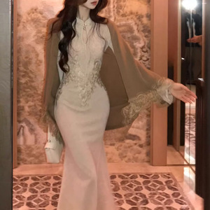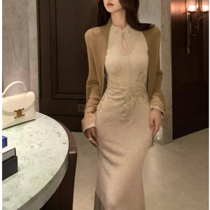 2025新款新中式巨好看的早秋连衣裙立领刺绣针织长裙开衫外套套装