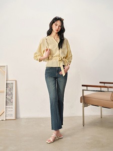 瞌睡兔 法式黄色收腰衬衫女秋休闲宽松显瘦薄款中长袖落肩V领上衣