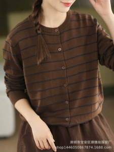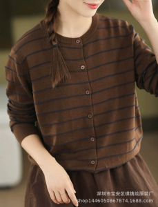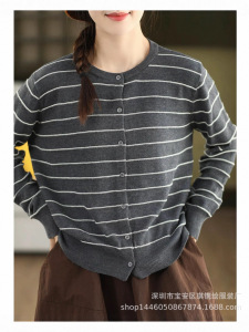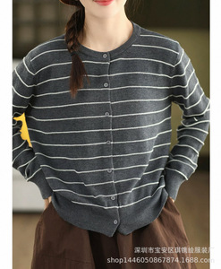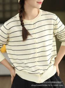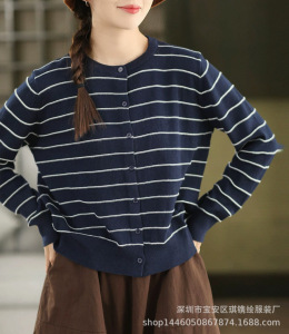琪镌绘制条纹长袖针织开衫女装秋季新款休闲宽松圆领时尚百搭毛衣