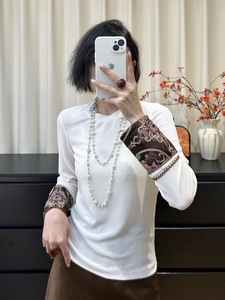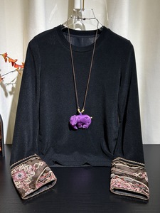 双色醋酸针织简约国风新中式圆领袖口刺绣宽松百搭秋季内搭上衣
