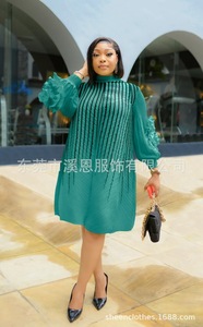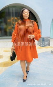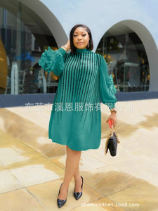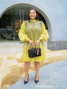 Miyaki三宅褶皱条纹印花手工盘花灯笼袖钉珠褶皱大码连衣裙女装跨