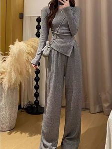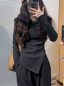 欧美跨境亚马逊不规则纯色修身上衣女春秋高腰阔腿长裤休闲两件套