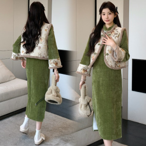孕妇装秋冬新款改良旗袍新款孕妇马甲加绒加厚连衣裙复古甜美两件