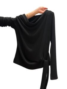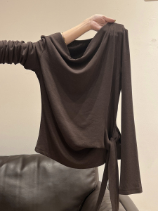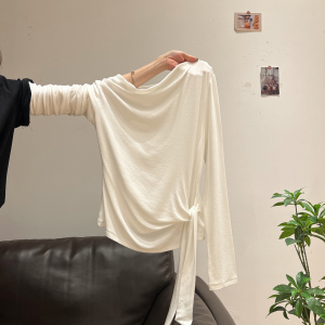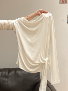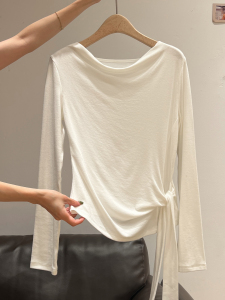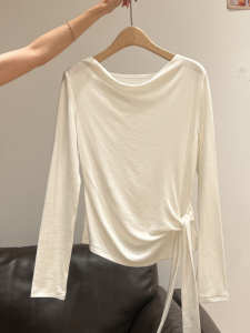 白色荡领侧绑带长袖T恤女秋季新款内搭打底衫设计感修身显瘦上衣