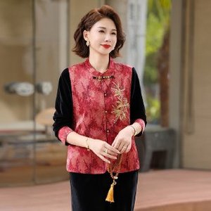 妈妈秋装金丝绒端庄大气套装女中老年人春秋国风马甲上衣三件套女