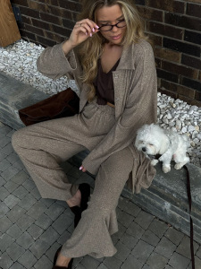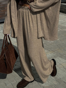 欧美休闲风女装软糯针织两件套翻领宽松长袖开衫抽绳直筒垂感长裤