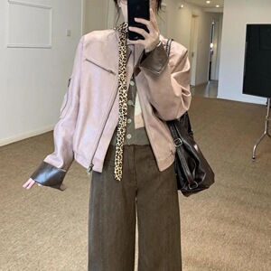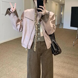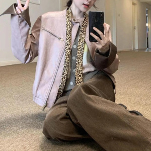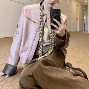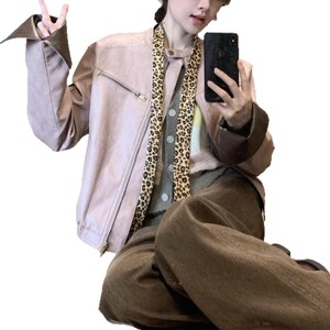美式复古酷飒风撞色pu皮衣外套女秋季独特超好看廓形休闲夹克上衣
