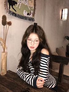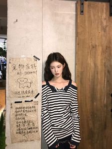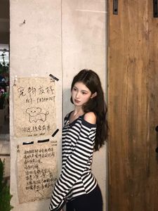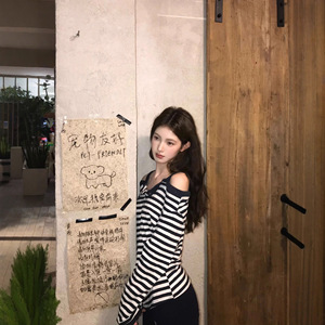 甜辣妹一字肩条纹长袖t恤女早秋设计感假两件显瘦休闲慵懒风上衣