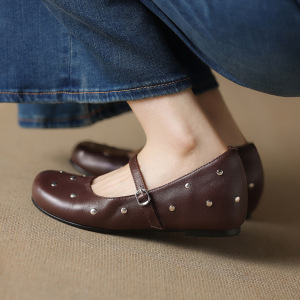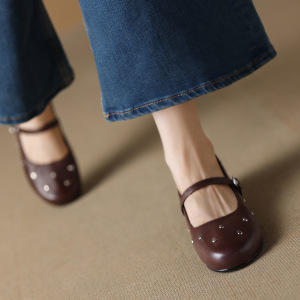 法式平底芭蕾舞小众单鞋女一字带铆钉温柔玛丽珍秋新款内增高女鞋