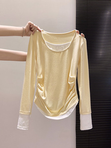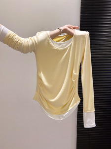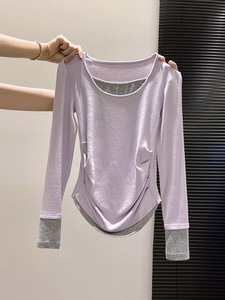 紫色t恤假两件长袖上衣秋新款修身收腰长袖假两件女打底衫女6973