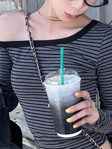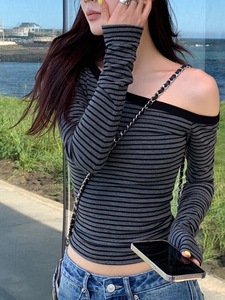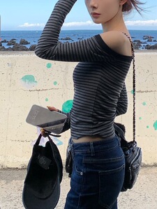 SUNONEON 设计感斜肩条纹打底衫女秋季长袖防晒修身休闲百搭T恤