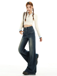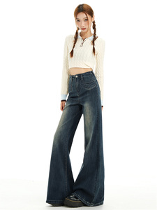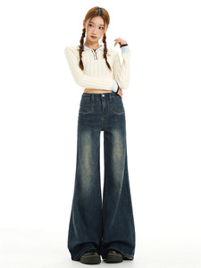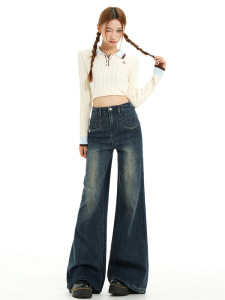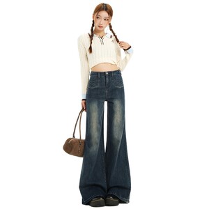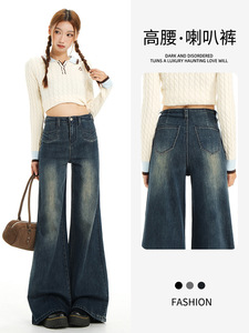 复古不贴腿微喇牛仔裤女秋美式高腰垂感小众前口袋遮胯阔腿喇叭裤