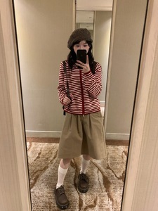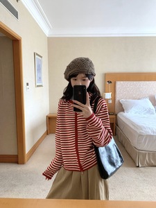 安可拉红色日系撞色条纹连帽毛衣外套2025秋季氛围感穿搭针织开衫
