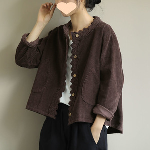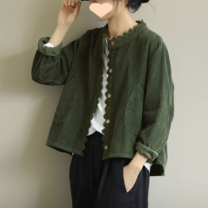 大码宽松文艺长袖圆领外套春装新款纯色灯芯绒蕾丝花边百搭短外套