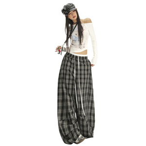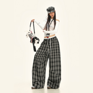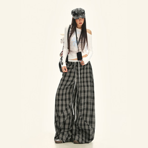【今茵】美式双腰头抽绳慵懒风格纹休闲裤宽松显瘦垂感阔腿弯刀裤