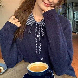 韩国衬衫领系带针织开衫女2025秋新款时尚百搭小个子短款外套上衣