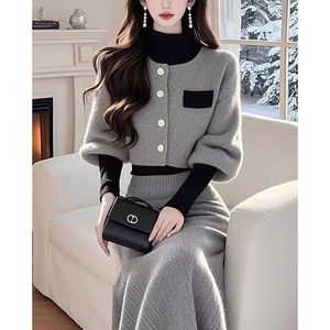 韩系名媛设计感针织时尚套装女秋冬季新款短款上衣a字半裙两件套