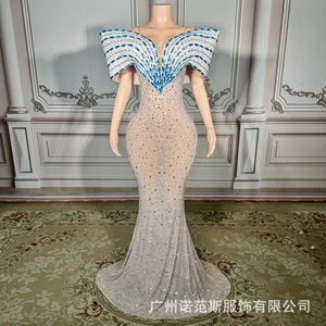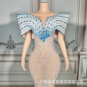 跨境新款独特设计蓝色亮钻一字领连衣裙走秀歌手俱乐部派对晚礼服