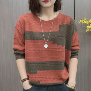 2025圆领拼色拼接新款时尚打底洋气针织衫女长袖宽松百搭上衣春秋