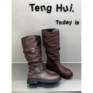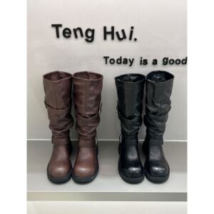 壹米恩2025年小众设计不过膝长靴女褶皱堆堆靴圆头高筒靴子骑士靴