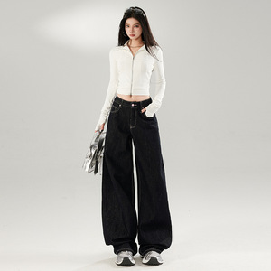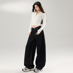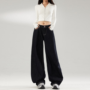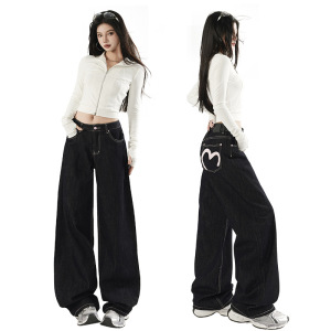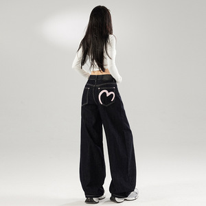 粉色爱心印花原色牛仔设计直筒宽松休闲拖地牛仔裤长裤&加长中裤