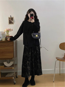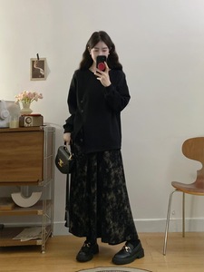 大码微胖高级感套装裙女秋季复古长袖上衣胖MM遮肉显瘦裙子两件套