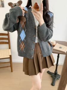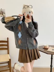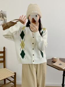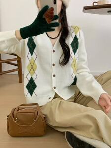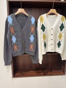 2025秋季新款韩版V领菱形格撞色长袖针织开衫女百搭毛衣外套现货