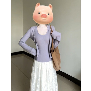 气质温柔针织开衫外套女秋季长袖薄款挂脖背心紫色设计感两件套装