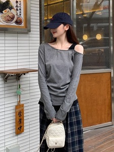 不规则miu系假两件灰色斜肩长袖T恤女早秋季巨好看露肩打底衫上衣
