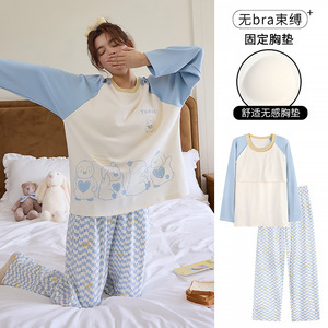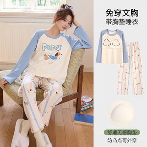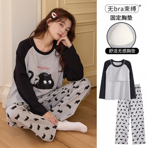 带胸垫长袖睡衣女春一体式薄款套头休闲套装2025新款家居服可出门
