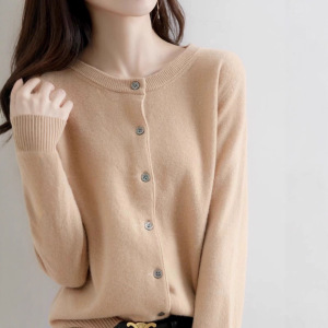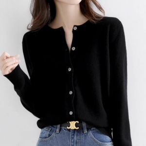 2025秋季开衫外套圆领宽松短款长袖毛衣外搭针织打底羊毛衫黑色女