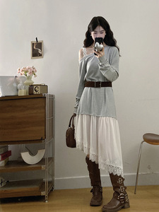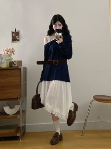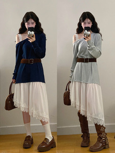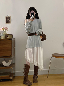 大码女装秋季松弛设计感斜肩卫衣拼接不规则蕾丝下摆连衣裙