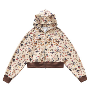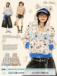 MAIKAO美式复古狗狗满印耳朵连帽卫衣女秋季宽松休闲开衫短款外套