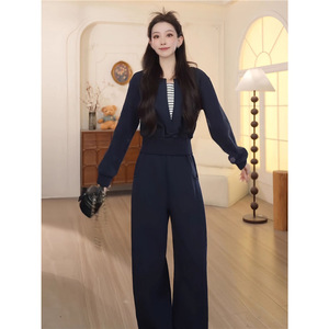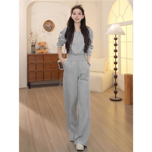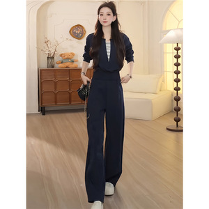 深圳南油休闲运动套装女秋季高级感假两件V领上衣阔腿裤两件套潮