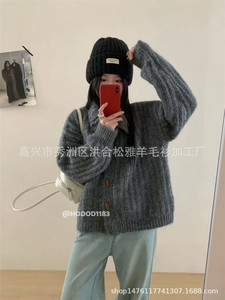 韩系复古牛角扣翻领毛衣外套女秋冬新款宽松慵懒百搭针织开衫上衣
