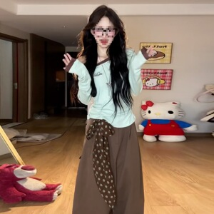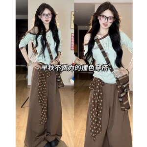 跨境韩系绿色露肩t恤女早秋5新绝美巨看腰修身长袖斜肩衣磨毛平板