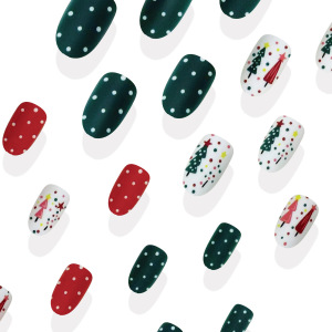 圣诞节短椭圆哑光红绿黄色波点圣诞树可爱风格穿戴甲美甲甲片指甲