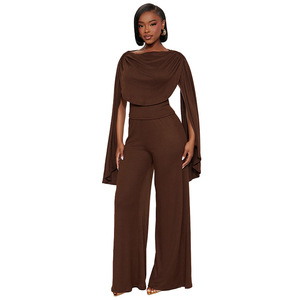 Q25ST290欧美女装秋季新款纯色休闲修身荡领无袖上衣坑条长裤套装