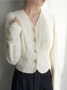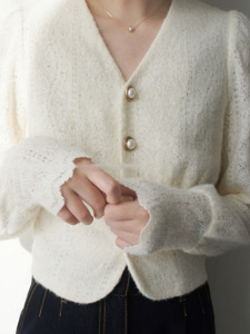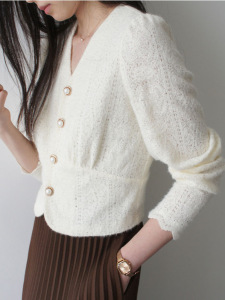 复古奶杏毛茸茸蕾丝V领衬衫温柔 质感珍珠扣上衣25秋冬