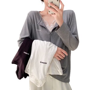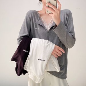 200斤胖妹妹秋装新款气质小心机蕾丝拼接领长袖小字母打底衫8259