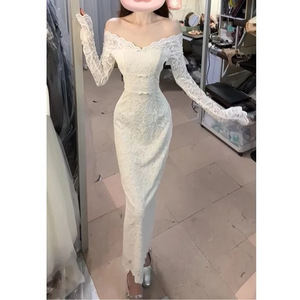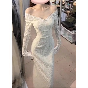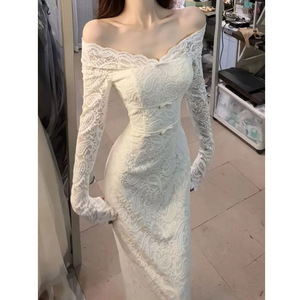 锦倩 【媚娘】优美一字肩V领长袖连衣裙蕾丝蝴蝶结气质开叉裙潮流