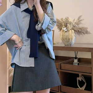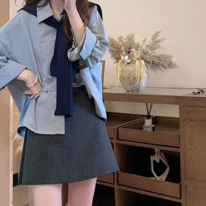 蓝色衬衫+半身裙+腰带+披肩(四件套)