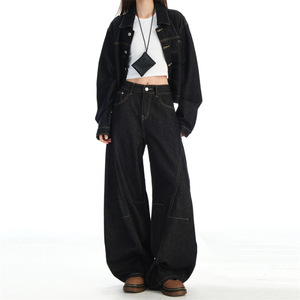 深蓝色车线分割弯刀牛仔裤女复古美式街头高腰显瘦松弛百搭阔腿裤