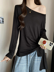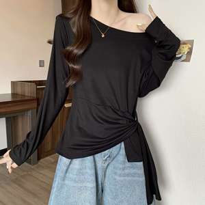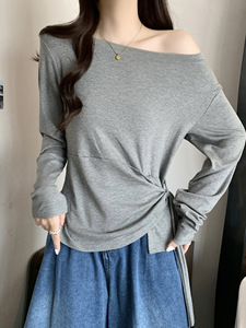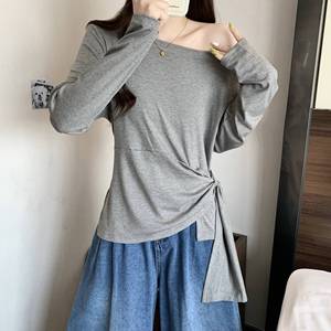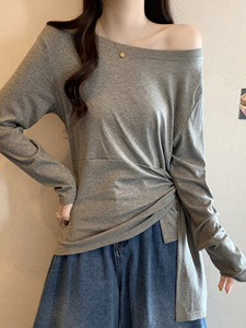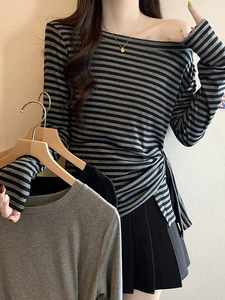 条纹一字领长袖t恤大码胖mm女025秋新款不规则收腰甜辣打底衫7236
