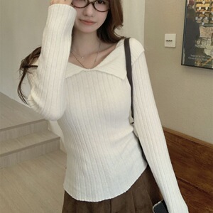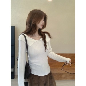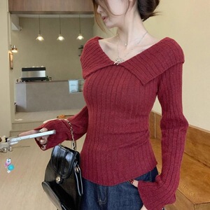 复古减龄翻领红色针织衫女秋冬新款设计感打底衫修身长袖百搭上衣