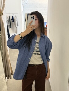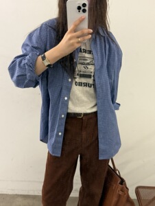 25缦恩韩东大门thebarn*et休闲宽松显瘦气质深蓝格子长袖衬衫女